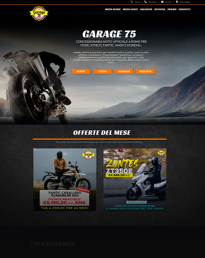 Garage 75 è una concessionaria moto con sede a Roma, leader nel centro e sud Italia, che offre moto nuove e usate, noleggio moto e scooter, officina, accessori, assistenza e molto altro.